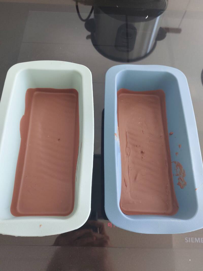 Giet de gesmolten melkchocolade in je 2 bakvormen.
