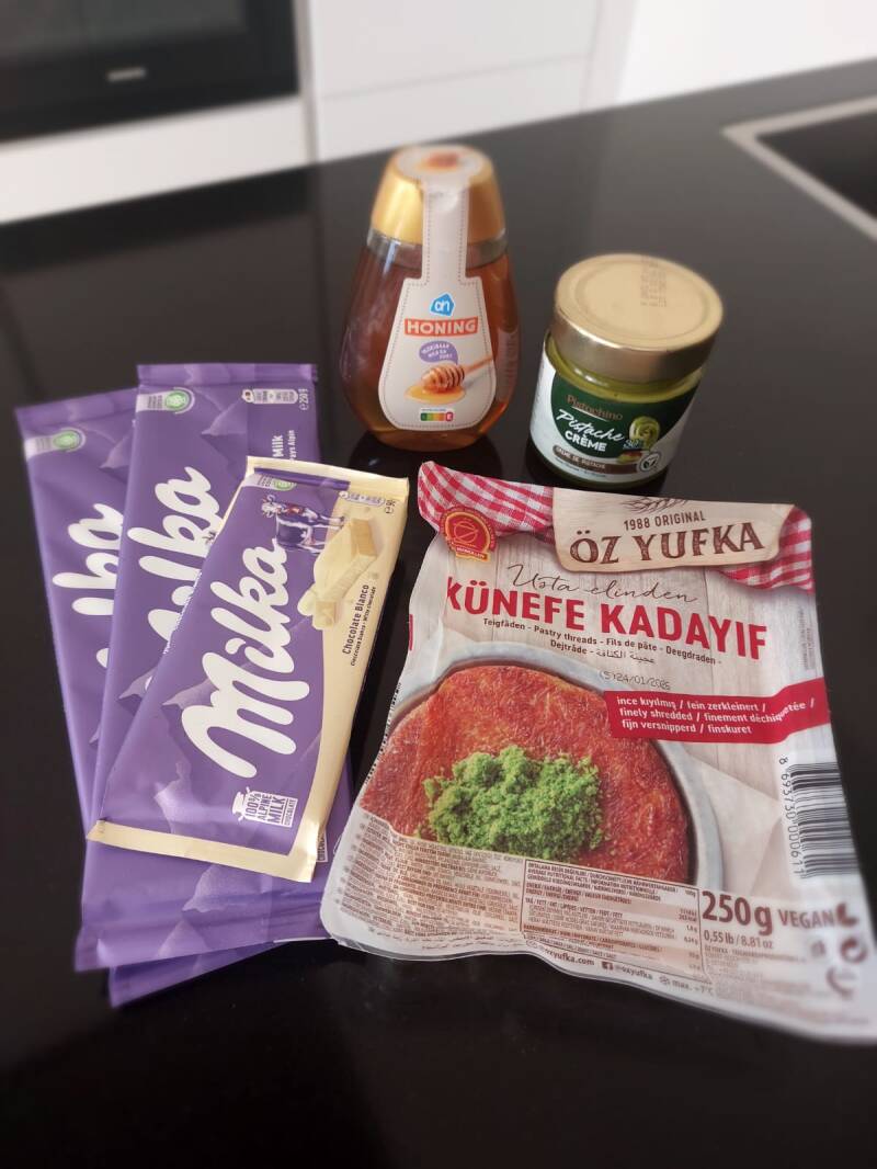 Met knapperig gebakken kadayif, smeuïge pistachepasta, zachte Milka-chocola en een tikje honing is dit geen snack.