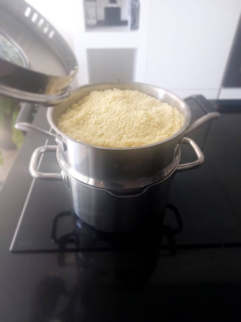 Doe de couscous in het bovenste deel van de stoompan. Zorg dat het water in de onderste pan kookt.