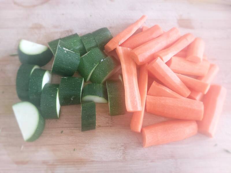 Voeg de gesneden zoete aardappel, kikkererwten, winterpeen, courgette en rozijnen toe.