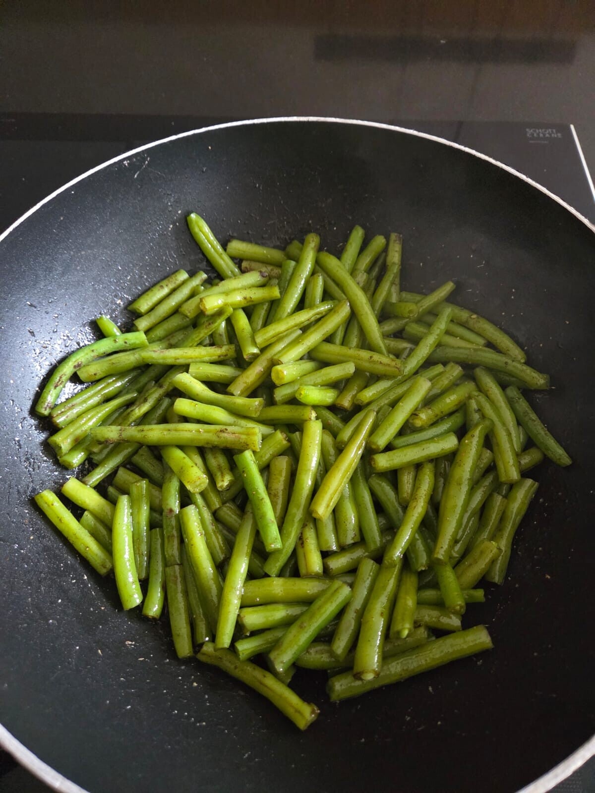 Voeg op het einde de sperziebonen en fijngesneden bladselderij toe. Alles nog even omscheppen.